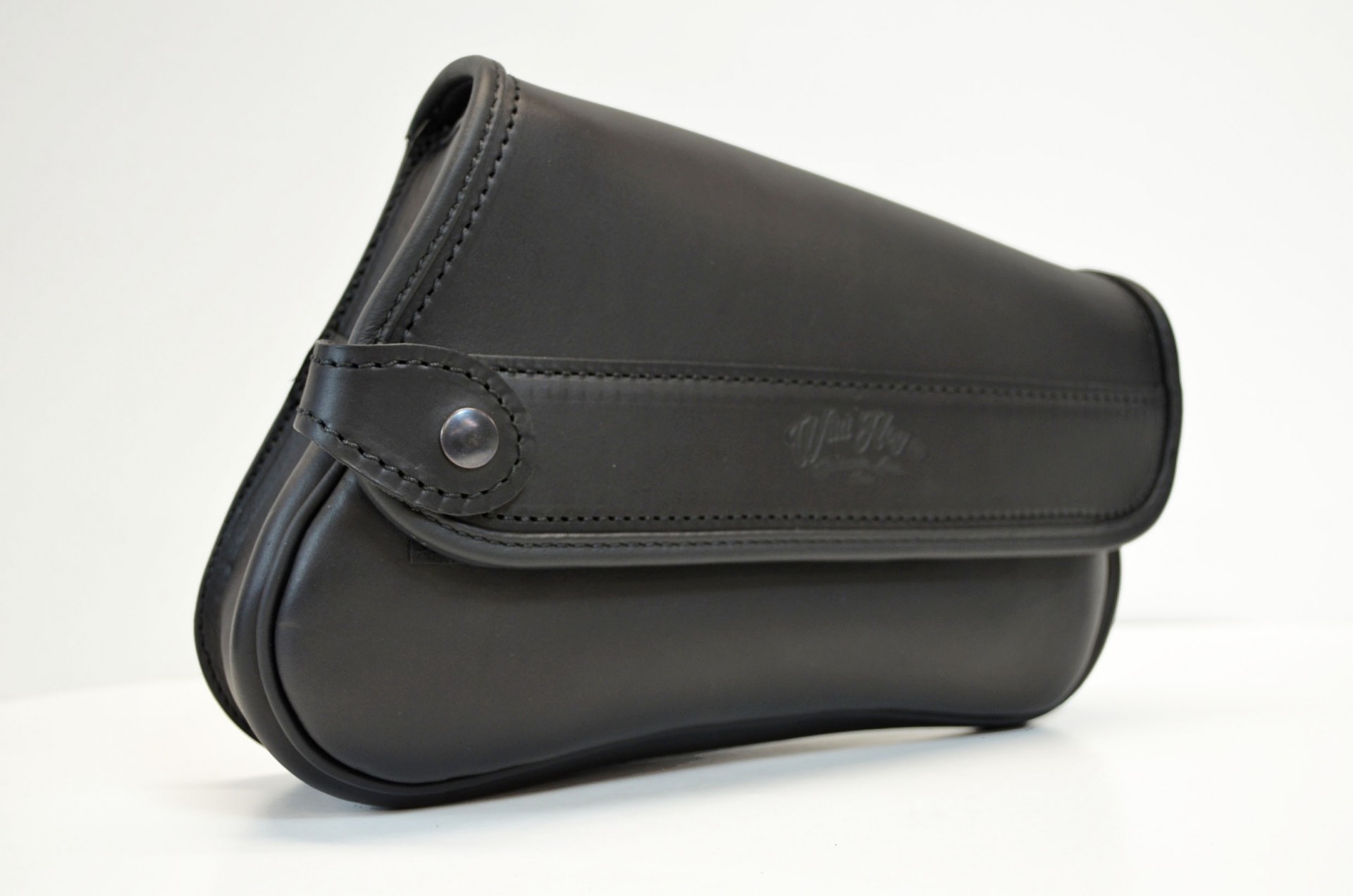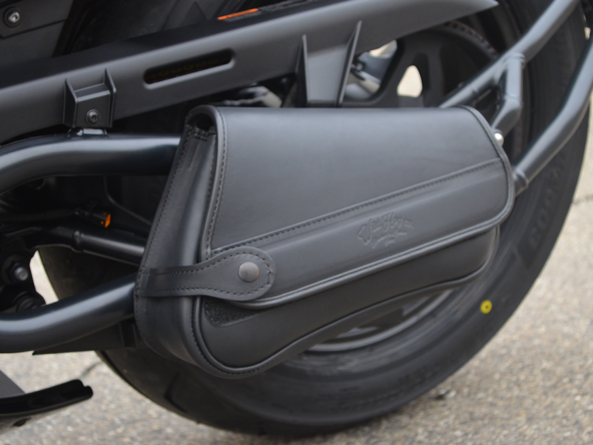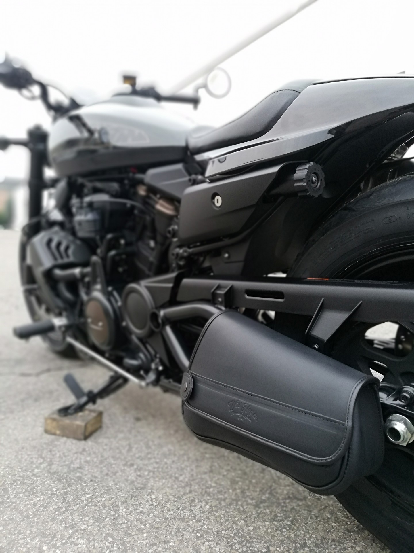 Compact bag in 4mm full-grain leather, specially designed for the left side of the HD Sportster 1250 swingarm.
