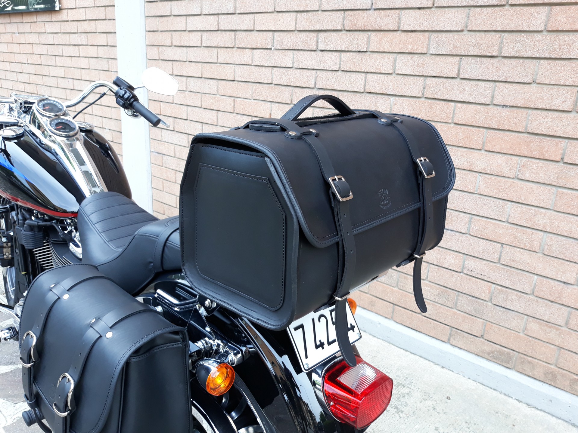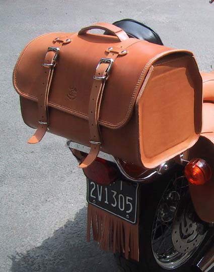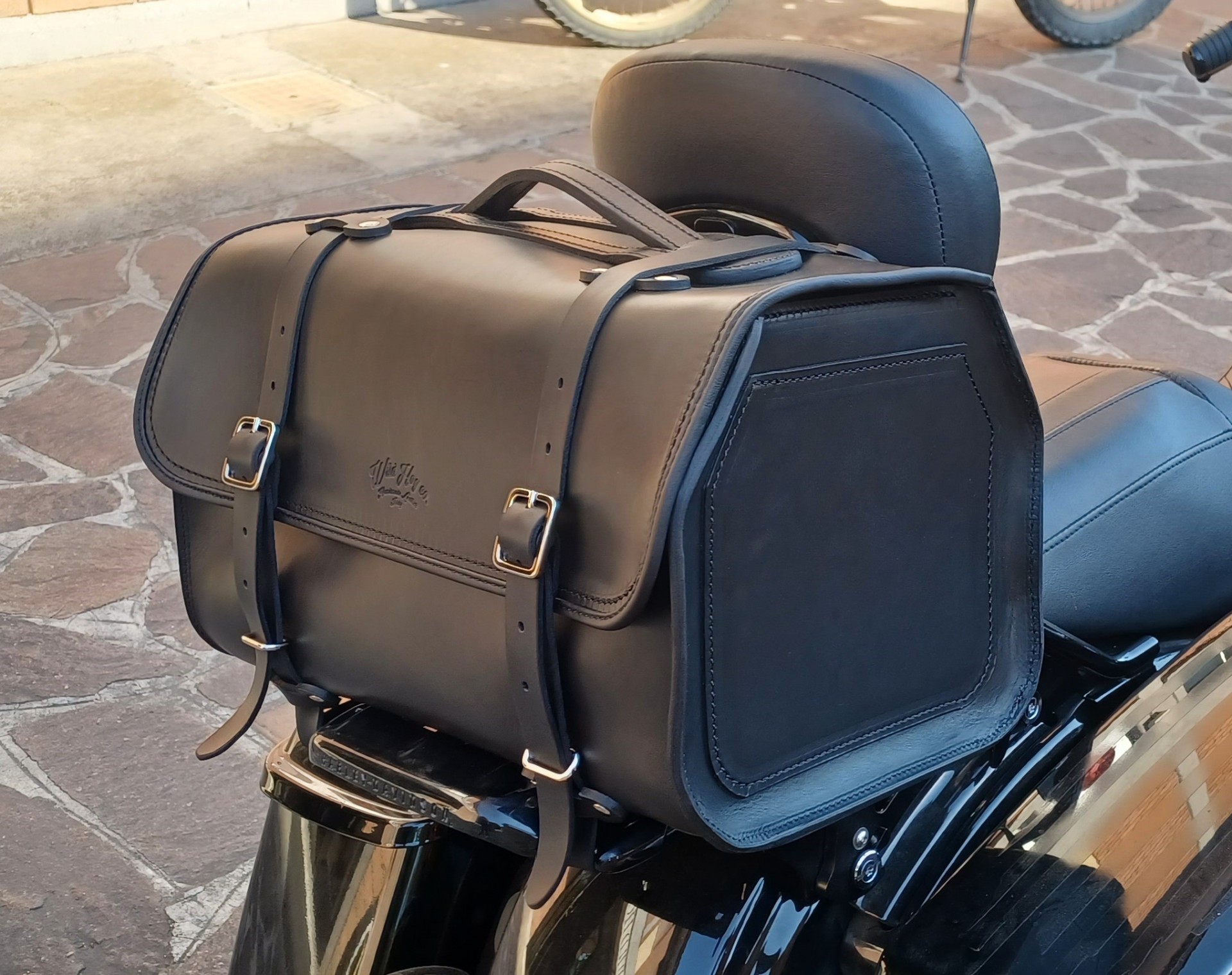 Motorcycle travel bag handmade in 4mm full-grain leather, greased and vegetable tanned.