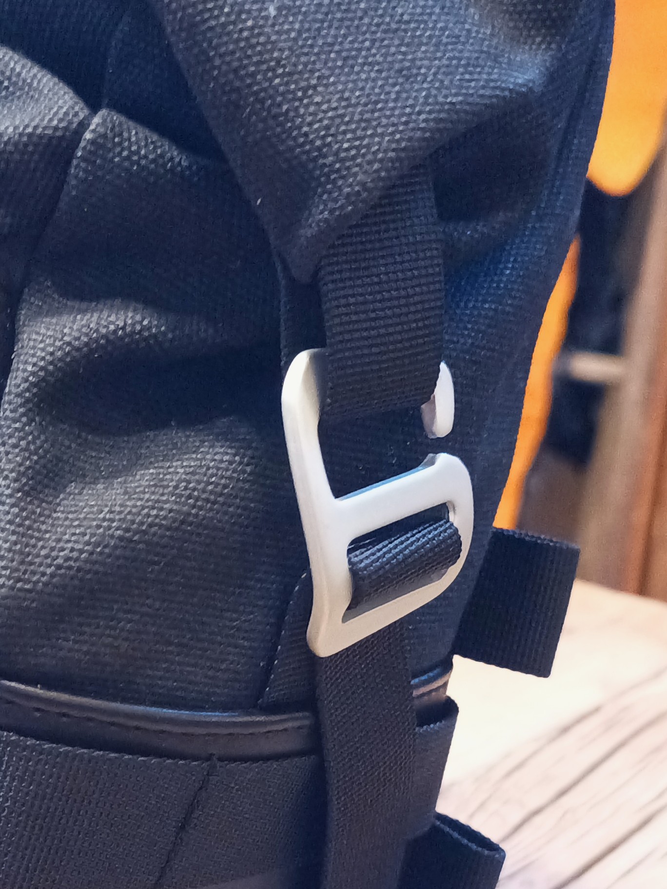 La borsa ha una chiusura a velcro e arrotolabile, per consentire un volume di carico variabile.