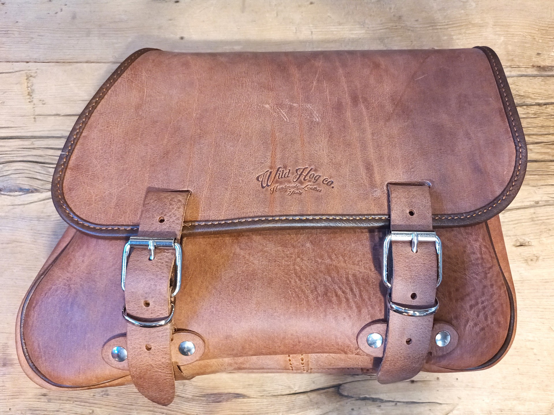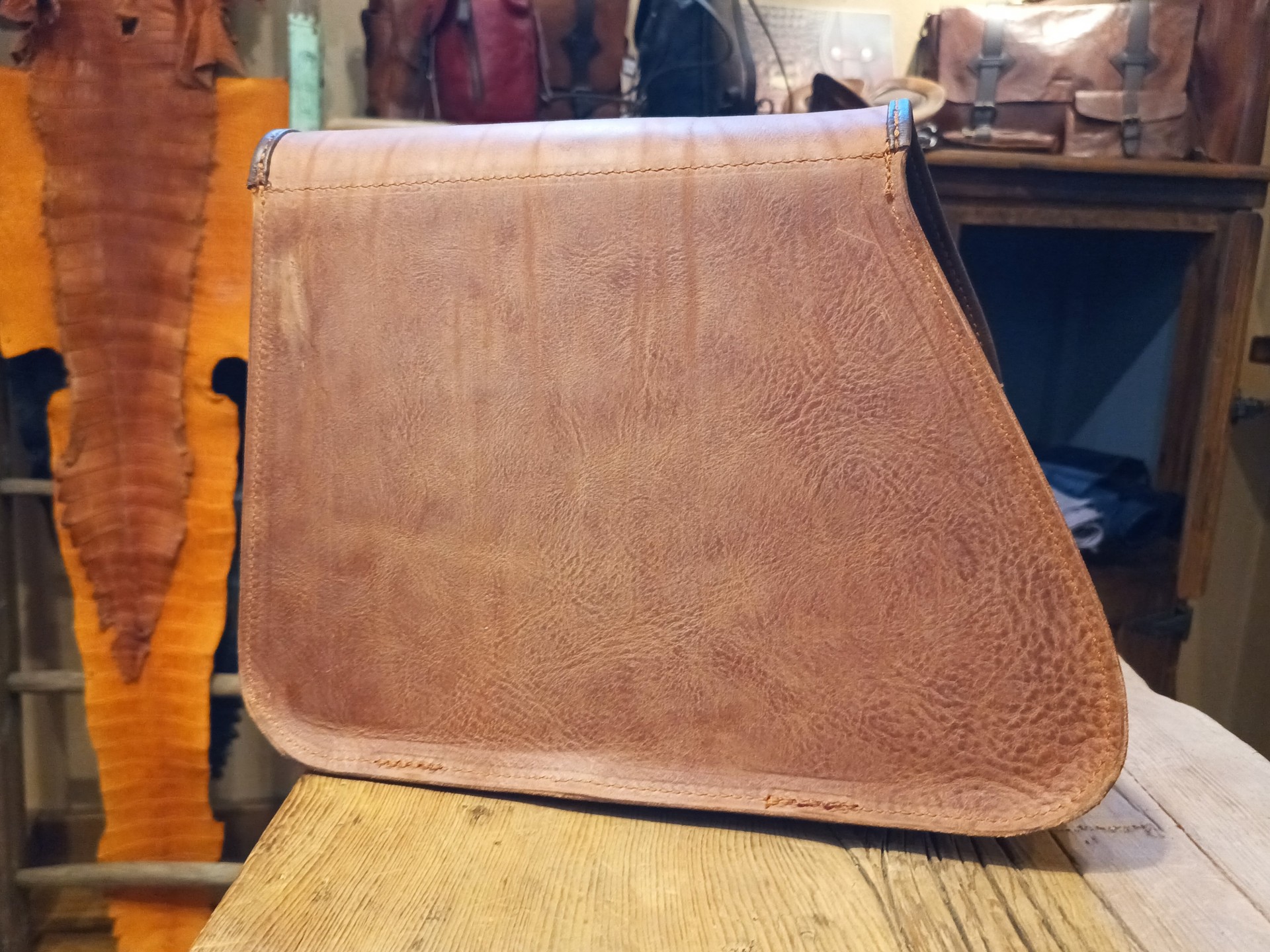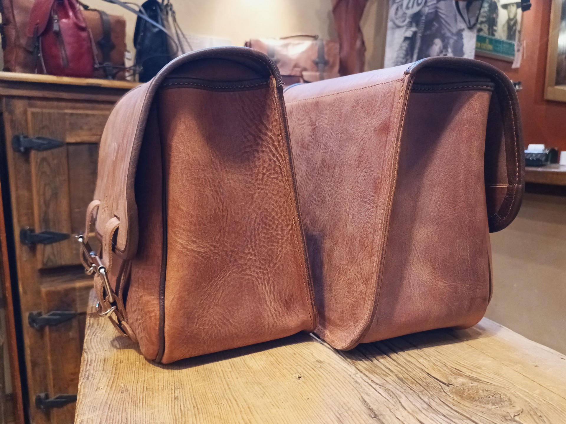 Coppia di borse sinistra e destra in cuoio marrone morbido, schiena rigida.