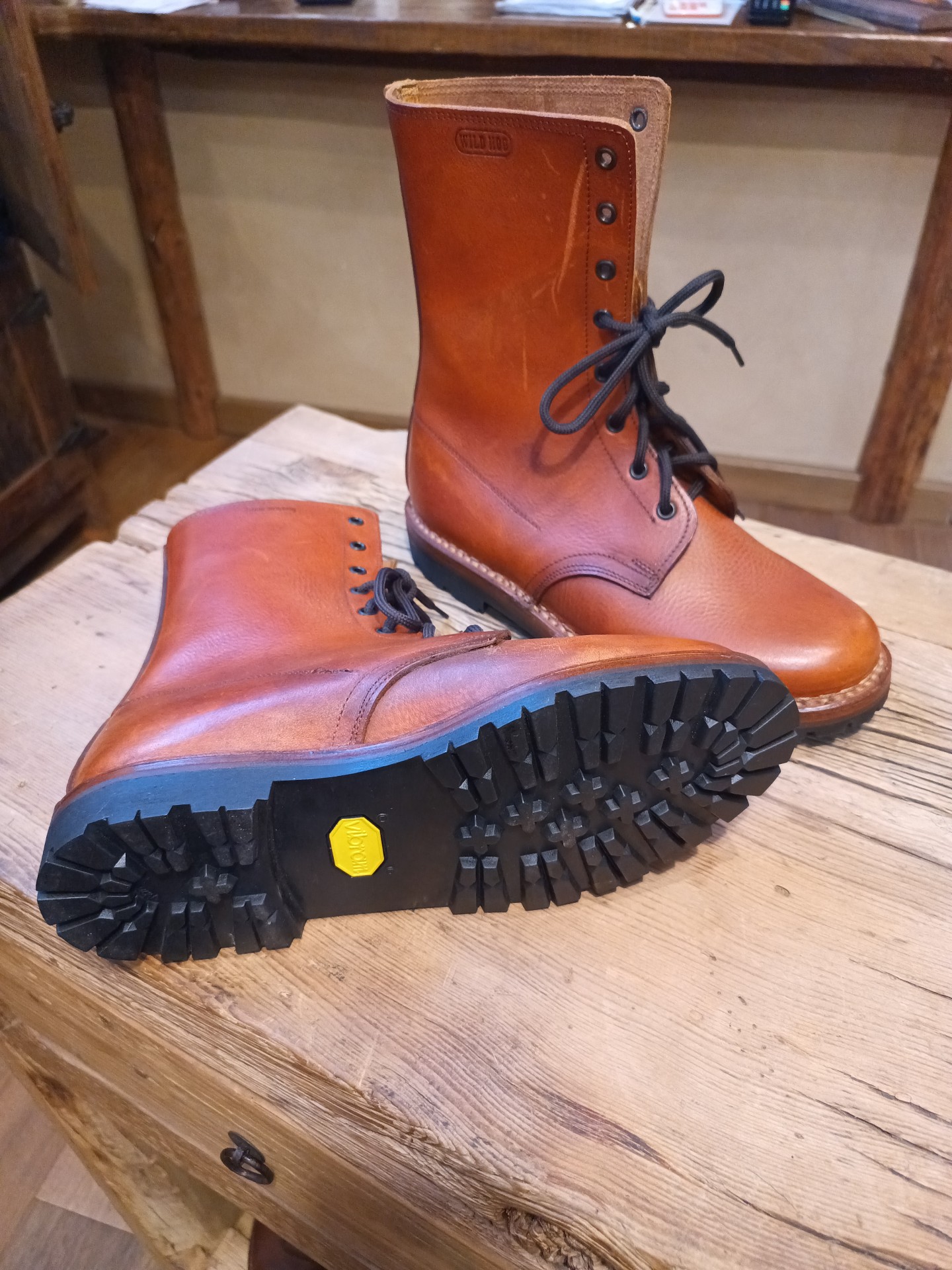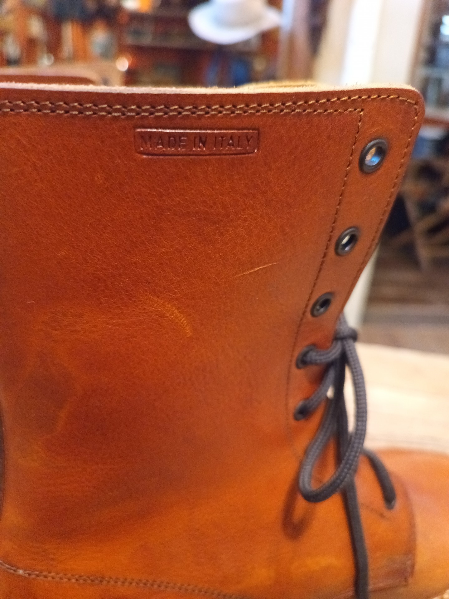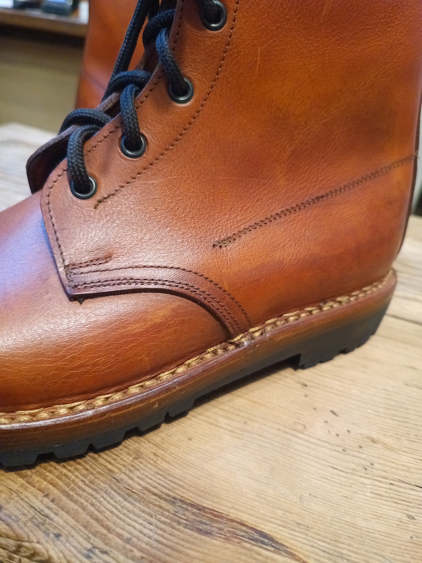 Contrafforti in cuoio, suola ed intersuola in cuoio, cucitura Goodyear, gomma Vibram applicata a caldo affinché sia risuolabile nel tempo. Cucitura linguetta alta in modo da impedire l’entrata dell’acqua e quindi rendere impermeabile l’anfibio.