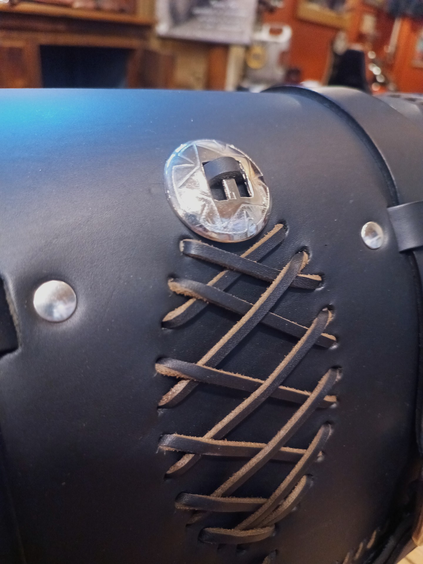 Borsa Express in doppio strato di cuoio nero, patta custom con finiture in cuoio fatte a mano e conchos.